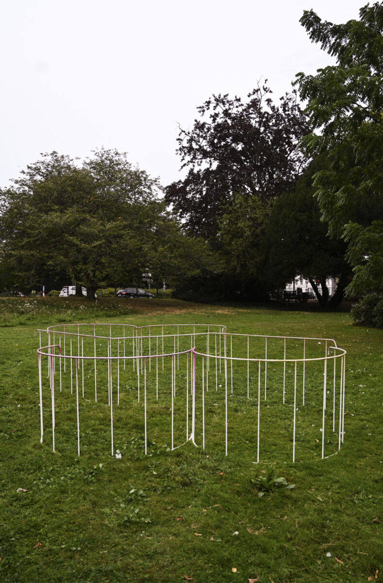 Ähm Tja Hm., 2018Installation im öffentlichen Raum, Kulturzentrum Gleis44, Keramik, Sound, Bewegungsmelder, Stahlrohr